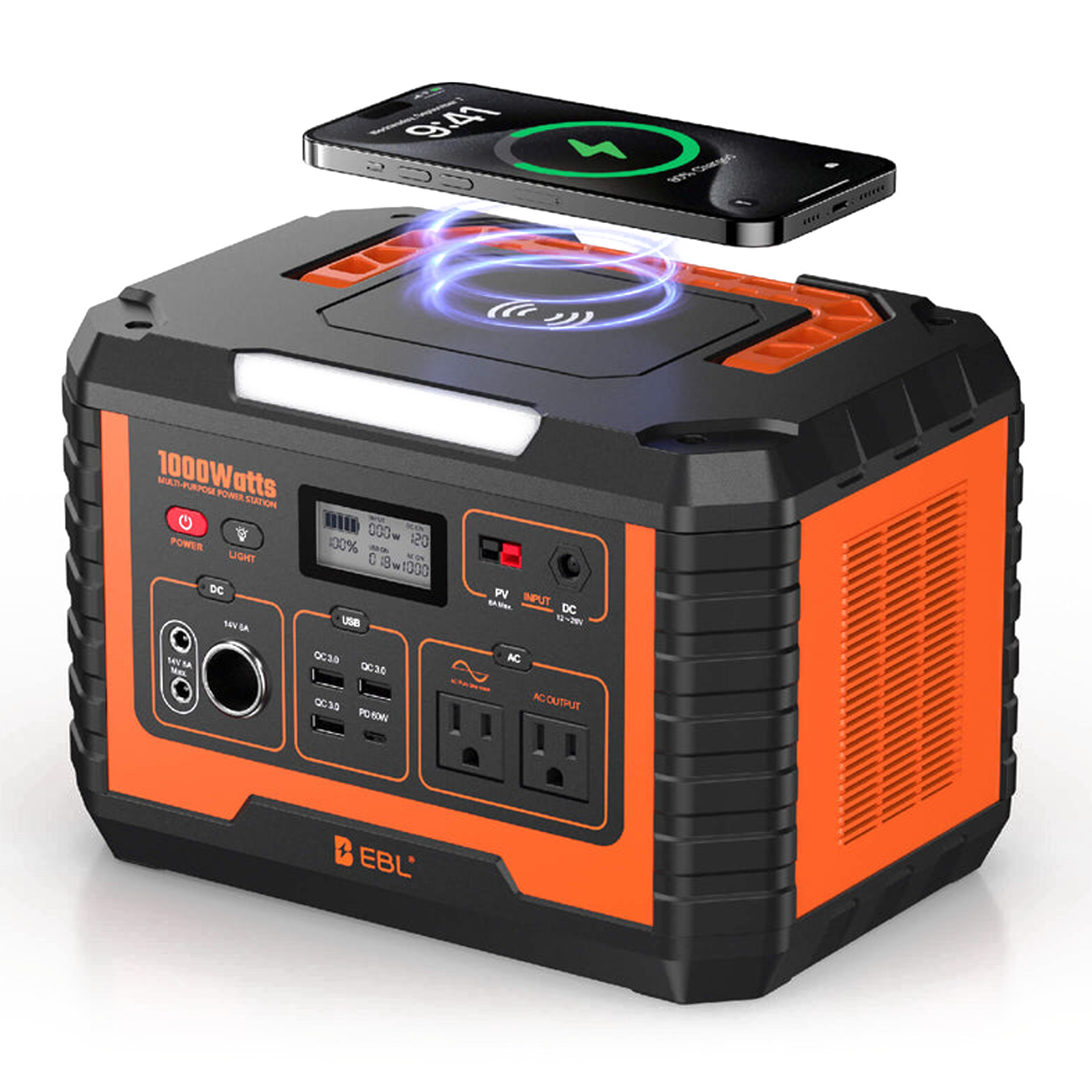 – EBL Power Station 1000W ofrece una capacidad de 1000W con 2 tomas de CA y 3 puertos USB para diversas necesidades de carga.